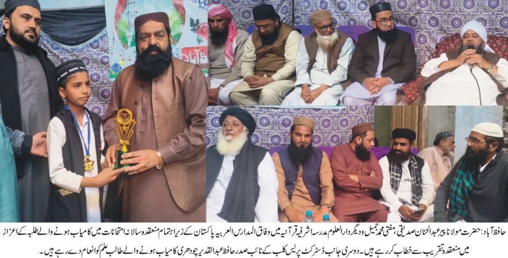 حافظ آباد(بیورورپورٹ) حافظ آباد کے قدیم معروف دارالعلوم مدرسہ اشرفیہ قرآنیہ (پانی پتی)ونیکے روڈ میں وفاق المدارس العربیہ پاکستان کے زیر اہتمام منعقدہ سالانہ امتحانات میں کامیاب ہونے والے طلبا و طالبات کے اعزاز میں ایک بابرکت اور عظیم الشان تقریب تقسیم اسناد منعقد ہوئی تقریب کے مہمانِ خصوصی سابق رُکن صوبائی اسمبلی ڈاکٹرمظفر علی شیخ تھے تقریب میں مسجد قدیم و مدرسہ اشرفیہ قرآنیہ کی انتظامیہ معزز شخصیات ثناء اللہ خان امیر محمد آفتاب اقبال شازی اور صحافتی نمائندوں نے شرکت کی مہتممِ اعلیٰ حضرت مولانا حافظ محمد نعمان سعید اعوان نے ادارے کی دینی و تعلیمی خدمات پر روشنی ڈالی اسٹیج سیکرٹری کے فرائض حضرت مولانا حافظ اللہ دتہ نے سر انجام دیے تقریب سے خصوصی خطاب حضرت مولانا پیر عبدالحنان صدیقی نے کیا اپنے خطاب میں حضرت مولانا پیر عبدالحنان صدیقی نے کہا کہ اللہ تعالیٰ نے ان طلبہ کو قرآنِ کریم جیسی عظیم دولت سے نوازا ہے جو دُنیا و آخرت کی کامیابی کا ذریعہ ہے انہوں نے طلبہ کو نصیحت کی کہ محض قرآن پڑھ لینا کافی نہیں بلکہ اسے یاد رکھنا اس پر عمل کرنا اور اپنی زندگی کو قرآن کے مطابق ڈھالنا ہی اصل کامیابی ہے تقریب سے حضرت مولانا مفتی محمد جمیل سمیت دیگر معزز علماء کرام حضرت مولانا عبد الولی محمد (جلال پور) مولانا سیف اللہ خالد مفتی محمد ذیشان قاری لیاقت علی اور عبدالوحیدنے بھی خطاب کیا جب کہ ڈسٹرکٹ پریس کلب کے نائب صدر حافظ عبدالقدیر چودھری نے کامیاب طلبا میں انعامات تقسیم کیے اور طلبہ کی کامیابی کو سراہتے ہوئے اساتذہ کرام کی شب و روز محنت اخلاص اور دینی خدمات کو زبردست خراجِ تحسین پیش کیا یہاں یہ امر قابل ذکر ہے کہ وفاق المدارس العربیہ کے سالانہ امتحانات میں مجموعی طور پر 15 طلبہ نے کامیابی حاصل کی جن میں چار طالبات بھی شامل تھیں جبکہ مدرسہ اشرفیہ قرآنیہ کے اندرونی سالانہ امتحانات میں 100 میں سے 100 نمبر حاصل کرنے والے 13 طلبا کو خصوصی اعزازات سے نوازا گیا نمایاں کارکردگی دکھانے والے طلبا میں ٹرافیاں گولڈ میڈلز اور خصوصی انعامات تقسیم کیے گئے جبکہ دیگر کامیاب طلبہ و طالبات کو اسناد دی گئیں آخر میں ملک و قوم کی سلامتی دارالعلوم مدرسہ اشرفیہ قرآنیہ اساتذہ کرام اور طلبہ کی مزید ترقی استقامت اور اخلاص کے لیے خصوصی دُعا بھی کی گئی۔