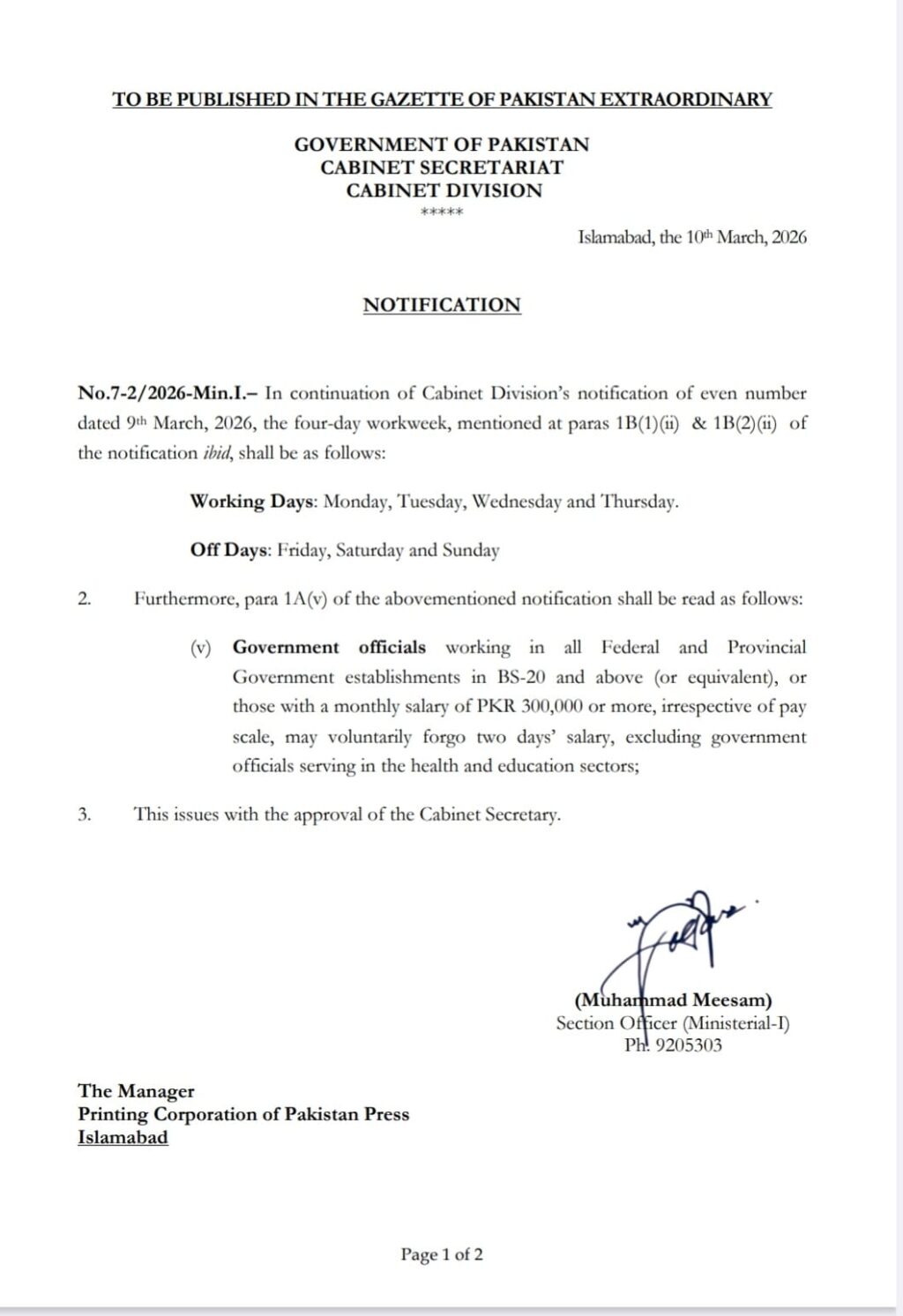 وفاقی حکومت نے ہفتے میں 4 دن ورکنگ ڈے کے اعلان کا نوٹیفکیشن جاری کر دیا